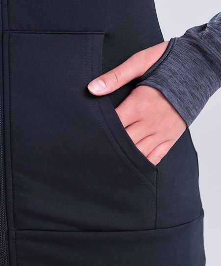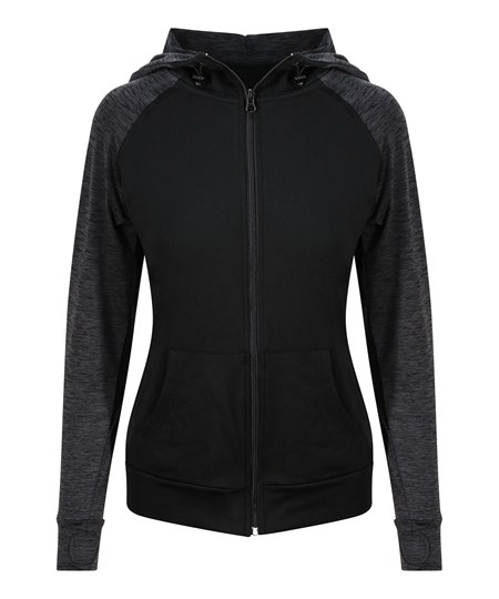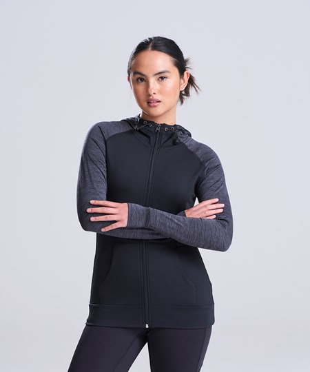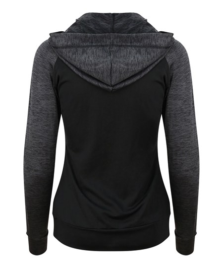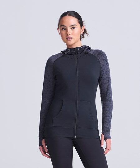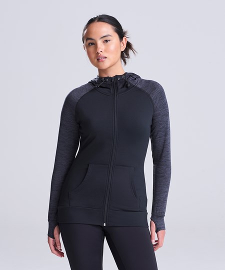 Push your limits with this innovative zoodie. Dual weight and supportive feminine fit allows you to focus on your workout goals. When the nights get chilly or you need a warm up hoody to throw on to and from the gym, the girlie cool contrast zoodie combines wicking performance with lightly brushed fabric on the body. Adjustable attached hood protects from the elements while the raglan sleeves and thumb holes offer great range of motion.