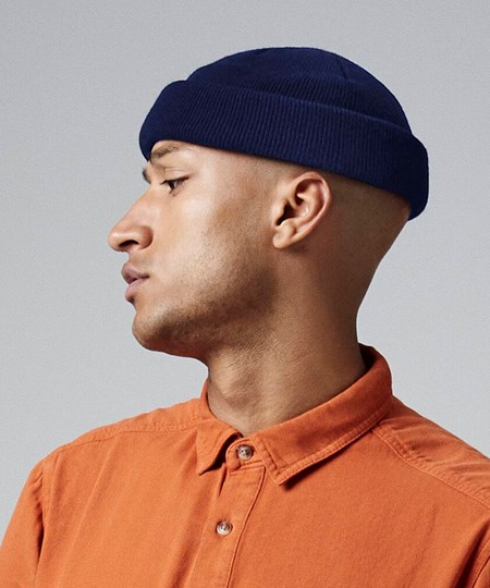Once reserved solely for workwear-inspired looks, the mini fisherman beanie has evolved into a popular street style essential. This mini pull-on style, featuring a double turn-up cuff, is a close-fitting beanie designed to sit on top of the head, just above the ears. Made from 100% certified recycled polyester, this neat design is perfect as both a sustainable and a fashionable choice.