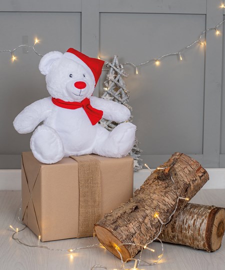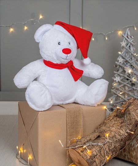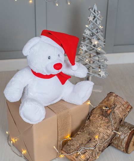 Cet ours festif saura égayer le Noël de chacun avec son bonnet tricoté et son écharpe rouges. Sur sa face antérieure peut être apposée une broderie, une impression vinyle ou par sublimation.