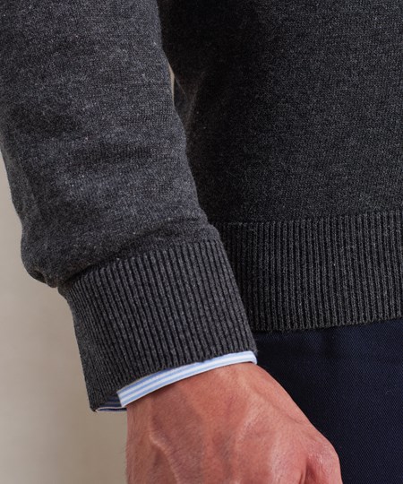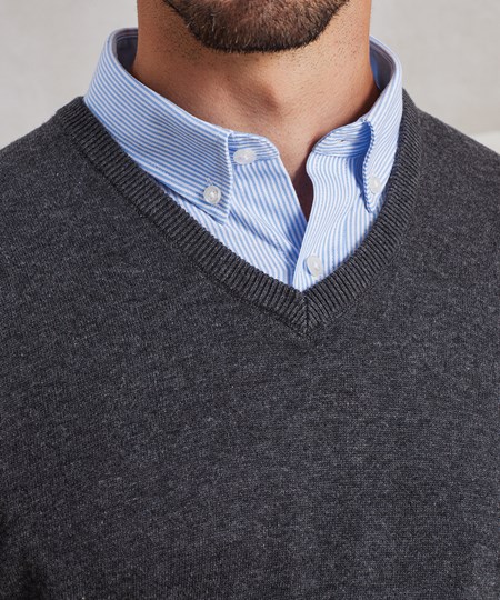 A V-neck long sleeve men's sweater made with a fine gauge knitted cotton rich yarn for a soft and comfortable feel. The set in sleeves and hem give a contemporary feel to the jumper making this a great piece to layer up over a shirt.