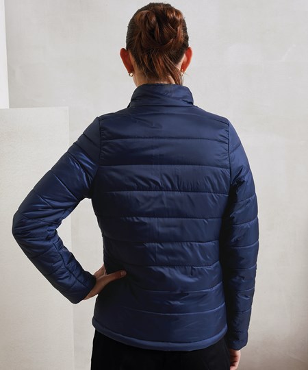 A lightweight and water-resistant padded jacket made from 100% certified recycled nylon and polyester for a great more sustainable outerwear solution. Horizontal stitching across the jacket creates baffles to ensure even distribution of the insulation within. This women’s ‘Recyclight’ jacket is filled with recycled synthetic down for warmth, whilst also being lightweight enough to fold away in its own stuff sack. Full zip-through style with two zipped side pockets and a handy open pocket to the inner lining. A zip in the inner lining provides full embroidery access, offering a great corporate or teamwear solution that can be branded accordingly. The fashionable nature of this jacket also means it can be worn as an everyday leisurewear style.